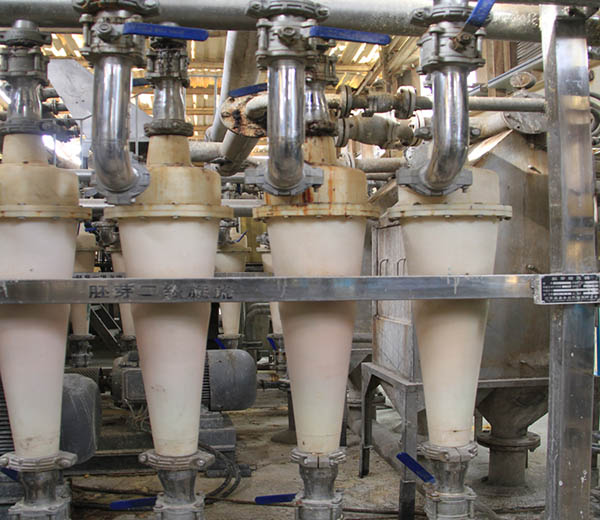 The starch slurry containing cracked steeped corn and germ is fed tangentially into the first pass cyclone with sufficient velocity to create a vortex action forcing the slurry into a spiral. As the rapidly rotating flow spins about the axis of the cone, the lighter germ fraction is forced to spiral inward and out through a centrally located overflow outlet.