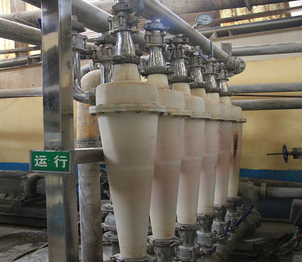 The heavier fraction (containing starch, hulls, uncracked kernels) is flung outward against the wall of the cone by the centrifugal force, and exits through the cone apex as underflow under pressure. The underflow is fed to the second pass cyclone to recover any germ that might not have been separated in the first pass. The first pass separates for optimum purity germ and the second pass increases germ recovery by capturing any germ that might have been bypassed in the first pass. The number of cyclones in each pass is determined by the feed flow to be handled. Degermination is repeated in a second stage after an intermediate secondary milling.